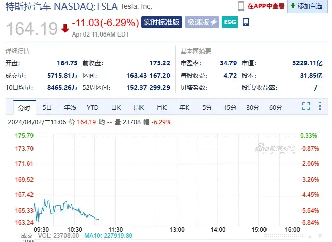 特斯拉股票在今日盤前交易中一度下跌逾7%。