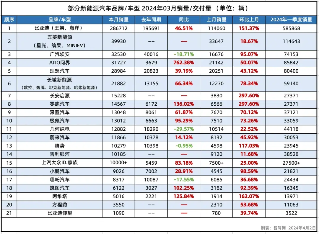 從特斯拉的市場表現(xiàn),我們再來看2024年3月和一季度新能源的銷量數(shù)據(jù)。會有一種更宏觀的視角。