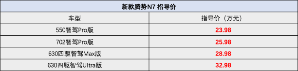 新款騰勢N7在4月1日這天迎來了上市,共發布了4款車型,指導價區間為23.98萬至32.98萬,相較于老款車型30.18萬的起售價,直接降了6.2萬,不過新款的入門款車型純電續航為550km,而老款車型的續航為702km。