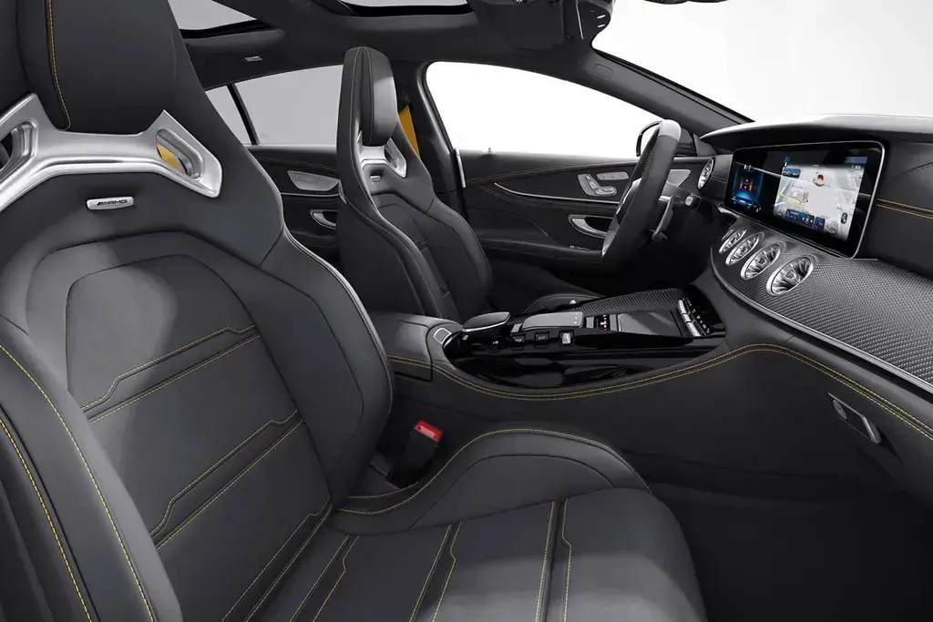 新車車身尺寸5054/1953/1460mm,軸距2951mm。前頭發動機艙線條感比較強,豎條型AMG中網頗有氣場,下格柵和左右導氣槽層次分明。大燈組采用幾何多光束大燈。車身側面修長溜背,門把手為半隱藏式,新車配備全車無鑰匙進入,無邊框車門,外后視鏡自動防眩目,輪轂尺寸為20英寸。支持選配后排隱私玻璃,電吸門。車身尾部燈組狹長,尾部配備電動尾翼,電動感應尾門。雙邊四出的排氣造型也很有戰斗氣息。